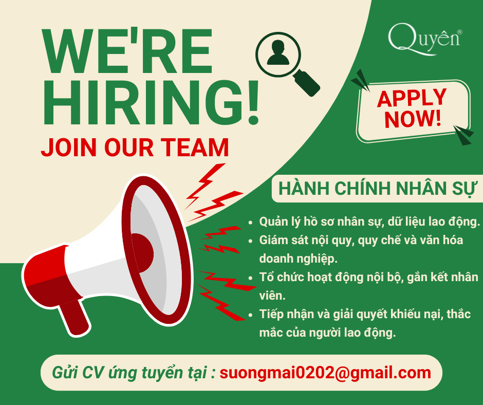 Gia nhập Mỹ Phẩm Quyên để cùng xây dựng môi trường làm việc chuyên nghiệp, gắn kết và phát triển bền vững. Chúng tôi mong chờ những ứng viên tâm huyết đồng hành lâu dài cùng Quyên!